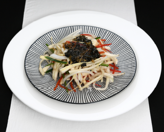 5. 라임쥬스, 흑임자와 유자청을 골고루 섞어 소스를 만들고 도라지와 야채를 넣어 버물려 접시에 담는다
