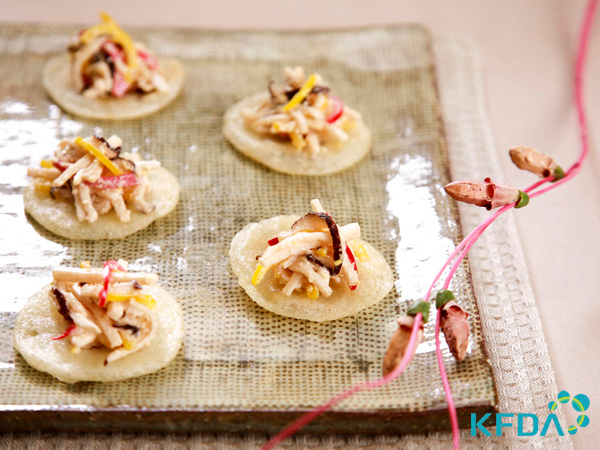 6. 채소볶음을 잣소스에 무쳐 찹쌀전병 위에 한 스푼씩 올려낸다.