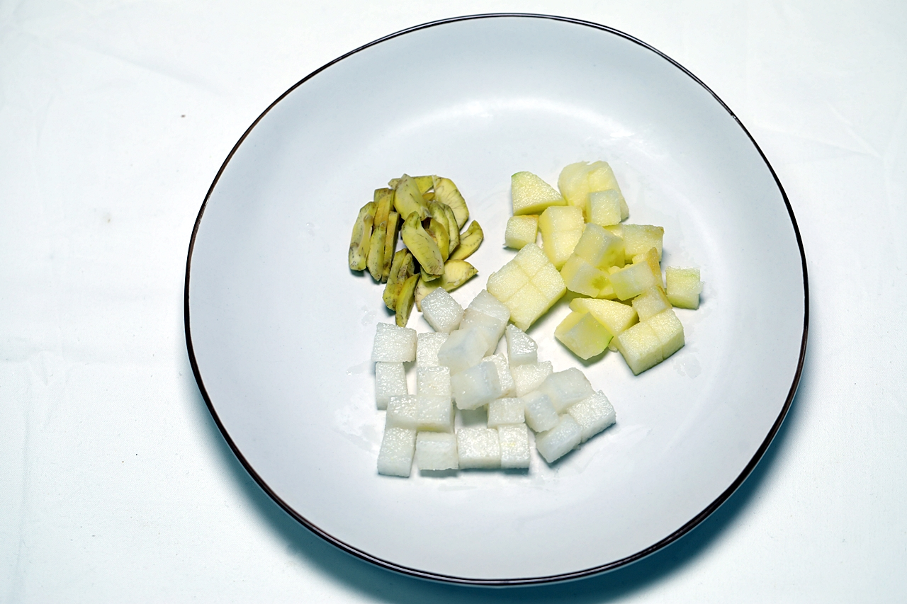 1. 사과와 배는 사방 2cm 네모로 썰고, 밤도 얇게 썰어준다.