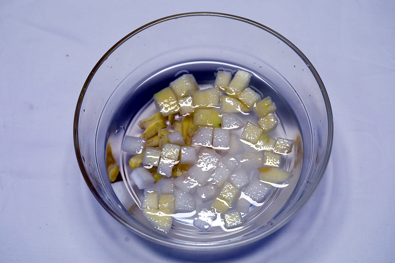 2. 1을 설탕물(물 1컵 + 설탕 2.5g)에 담근다.