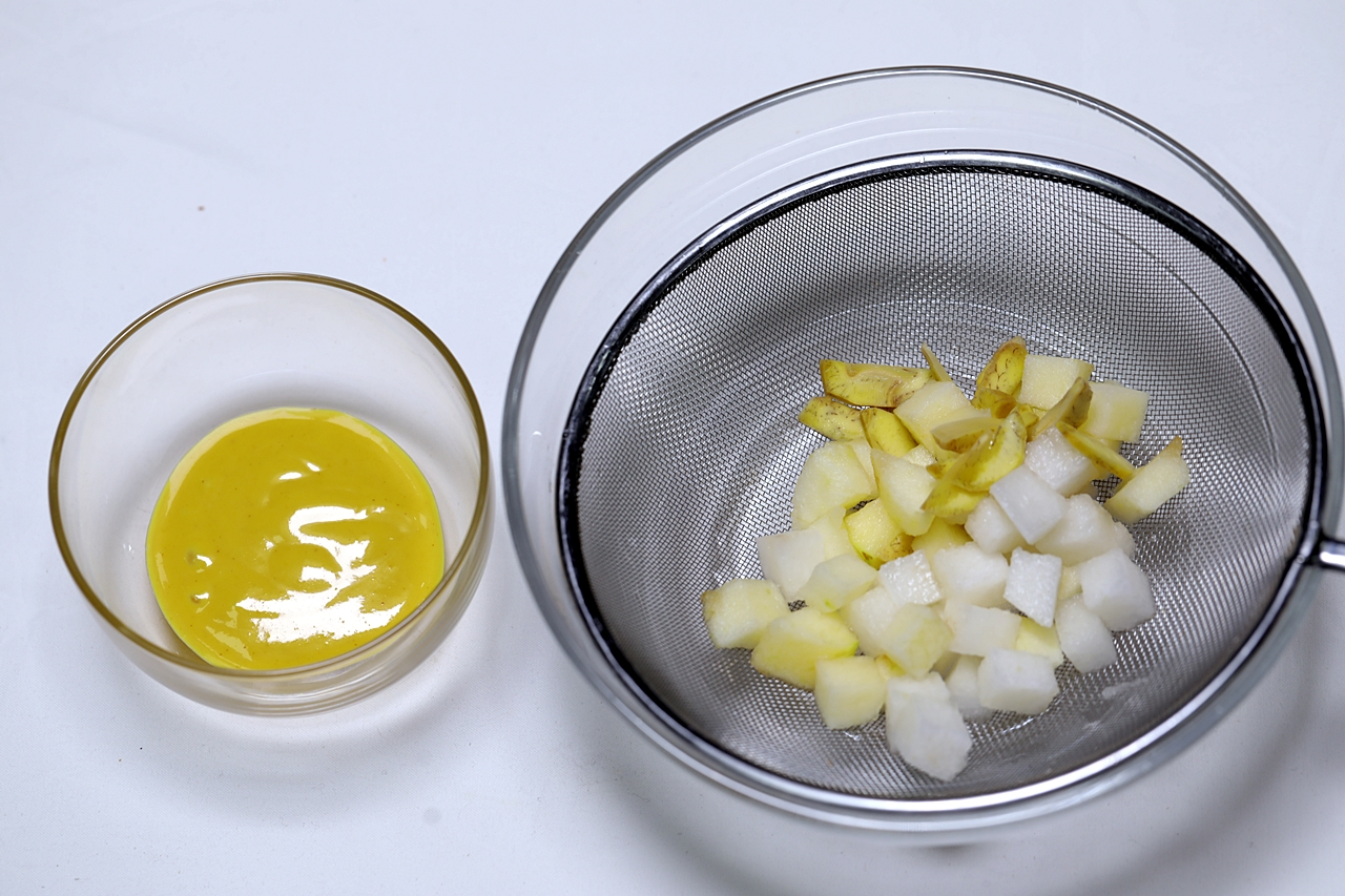 5. 과일을 체에 받쳐 물기를 빼고 소스에 버무린다.