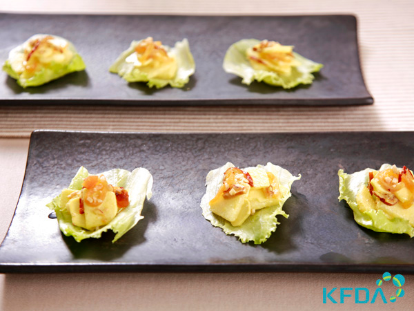 6. 한입 크기로 자른 양상추에 샐러드를 올려낸다.