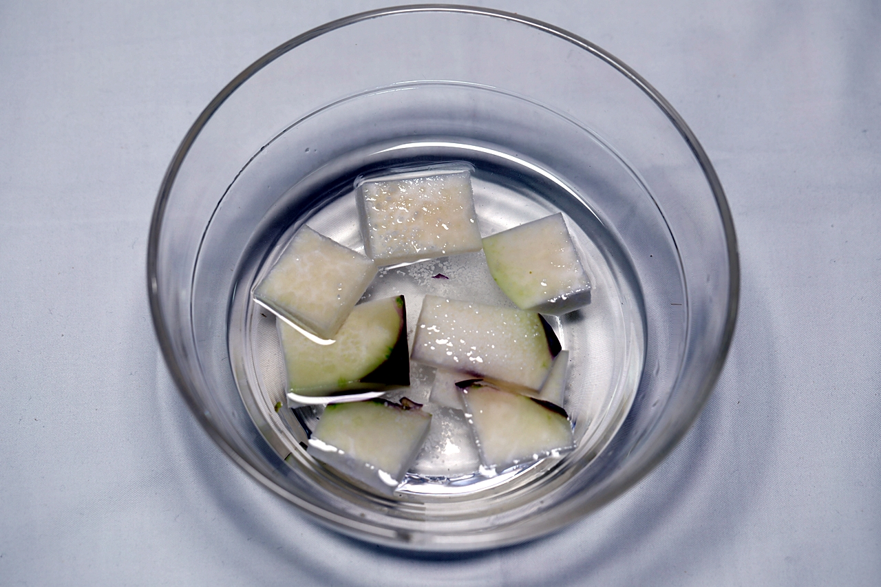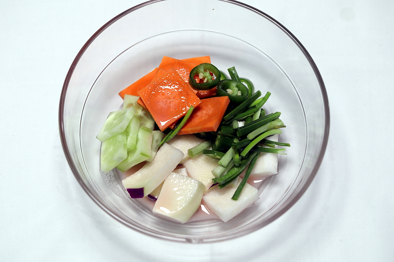 콜라비 10g, 당근 3g, 오이 6g, 청고추 2g, 홍고추 1g, 실파 0.5g, 소금 0.5g, 물 60g, 찹쌀가루 10g, 배 10g, 적양파 10g, 소금 1g