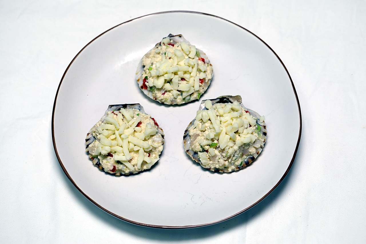 5. 개조개껍질 안쪽에 참기름을 바르고 5의 재료를 넣고 모짜렐라치즈를 뿌린다.