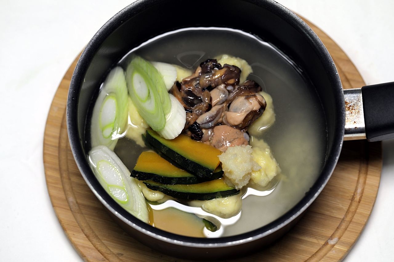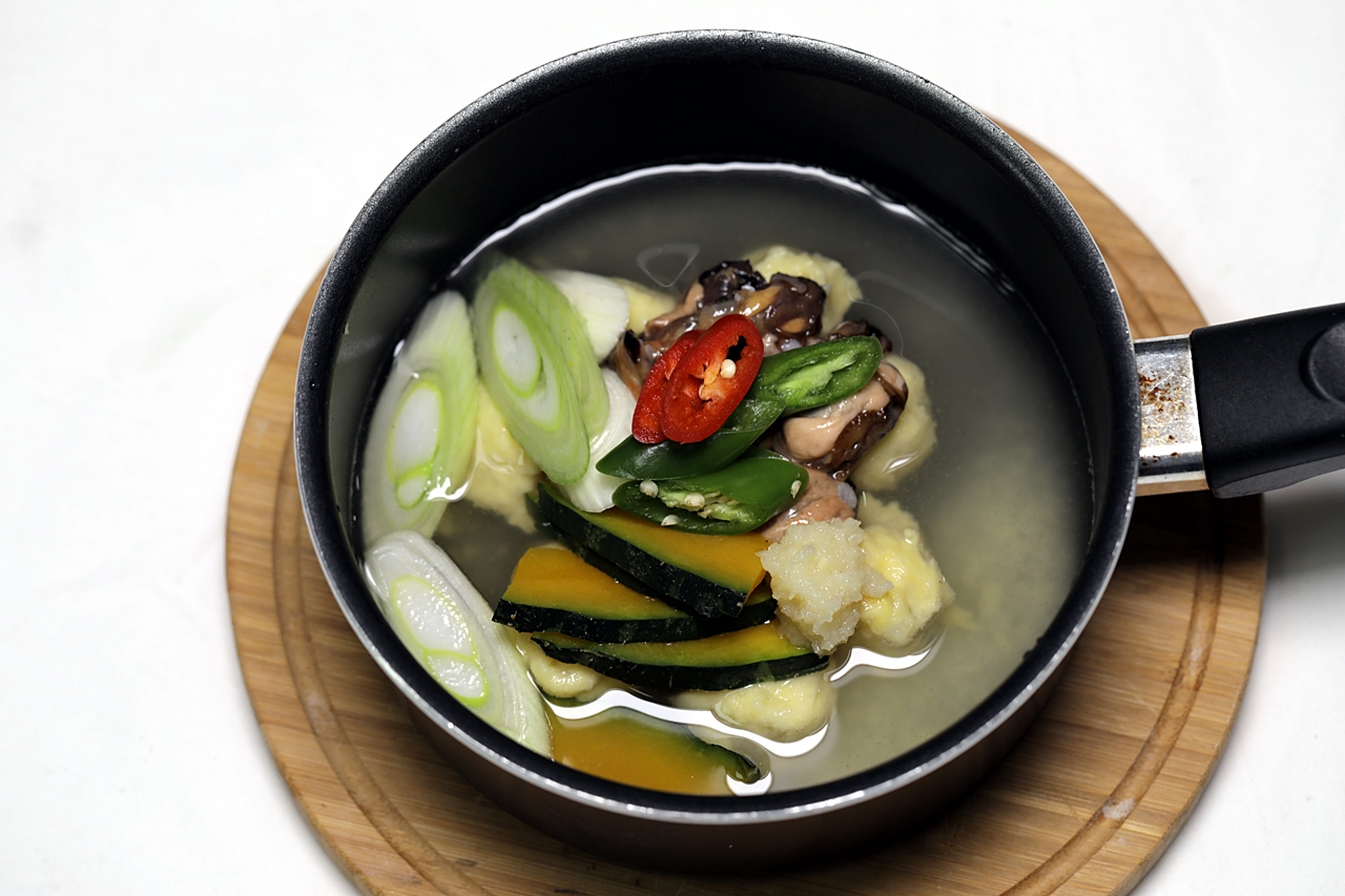 5. 멸치다시마국물이 끓으면 옹심이를 넣고 익어서 떠오르면 홍합, 호박, 다진 파, 다진 마늘, 다시마를 넣고 국간장으로 간을 한다.
