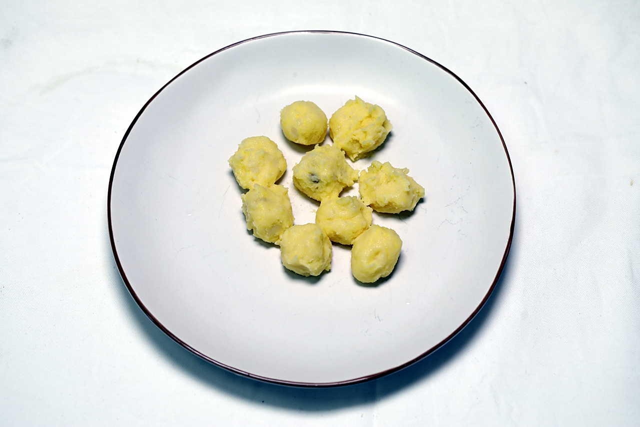 3. 2의 재료에 쌀가루, 달걀노른자, 현미유, 소금을 넣고 반죽하여 구슬크기의 옹심이를 10개 정도 만든다.