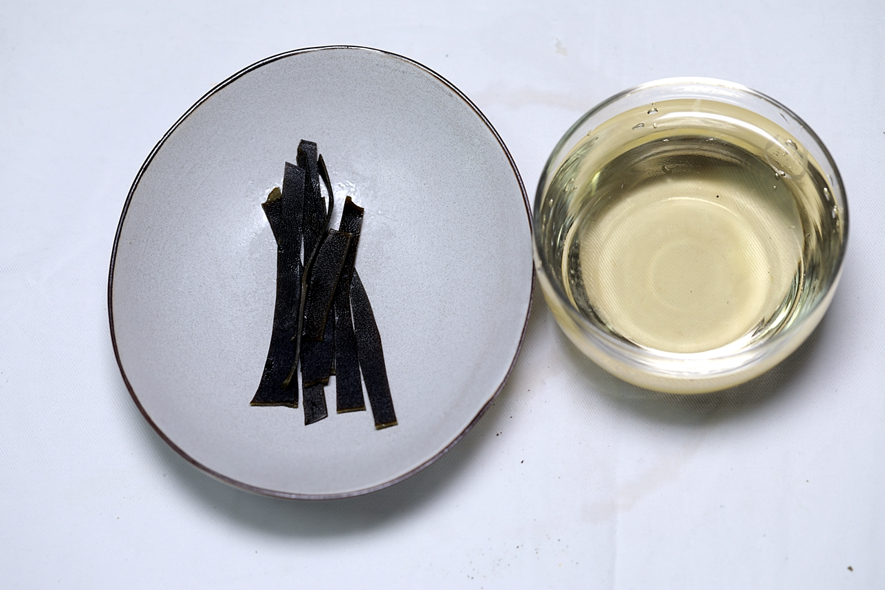 1. 물 1컵 반에 홍합, 국멸치, 건다시마, 양파를 넣고 멸치다시마국물 1컵을 내고 다시마는 건져 채 썬다.