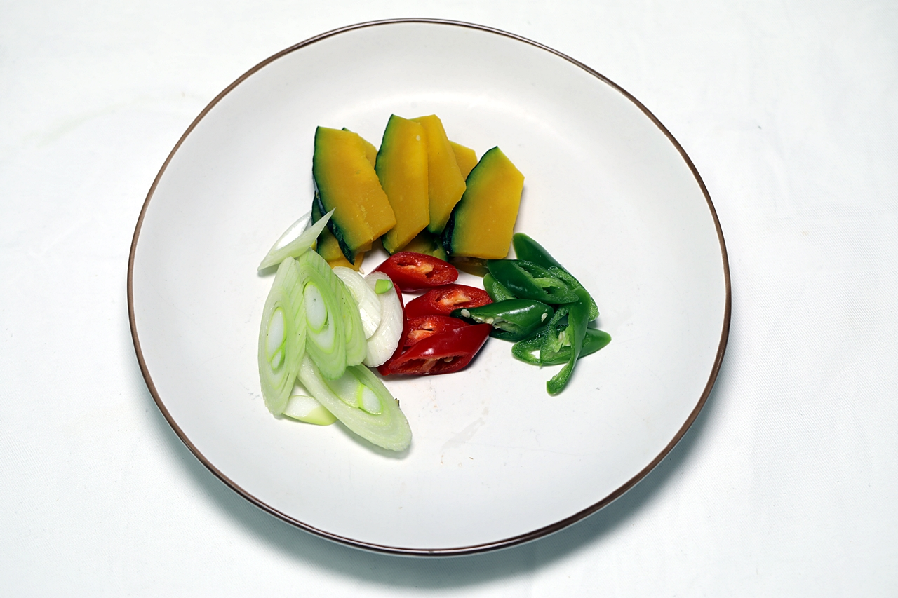 4. 호박은 돌려깍기하여 2cm 가량으로 채 썰고 파, 홍고추, 청고추는 어슷썰기 한다.