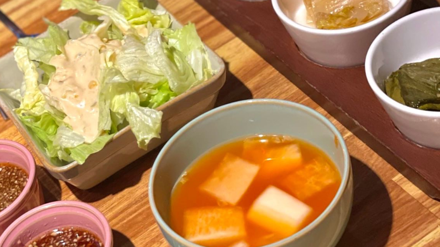 메뉴로는 기본 찬으로는 샐러드와 깻잎, 절인 배추, 김치 등이 나옵니다. 이는 내장류의 느끼함을 덜어주기에 좋은 선택이죠.