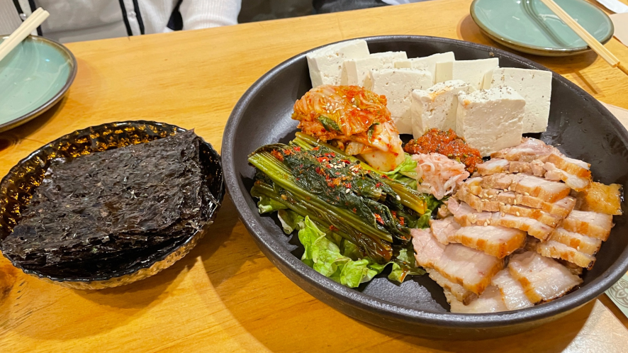 제가 주문한 메뉴는 두부플래터였는데, 두부, 한돈수육, 돌산갓김치, 완도돌김, 청어알젓무침 등이 들어있어서 다양한 맛을 한번에 즐길 수 있었습니다. 두부는 포실하게 썰려 나와서 든든하게 먹을 수 있었고, 수육은 촉촉하고 껍질은 쫄깃했습니다. 그리고, 처음 먹어본 청어알젓무침은 정말 신선하고 맛있었습니다. 두부와 고기에도 모두 잘 어울리고, 흰 쌀밥에 올려 김에 싸 먹으면 더욱 맛있게 느껴졌습니다. 추가로, 청어알젓과 김은 리필도 가능해서 여유롭게 맛볼 수 있었습니다.