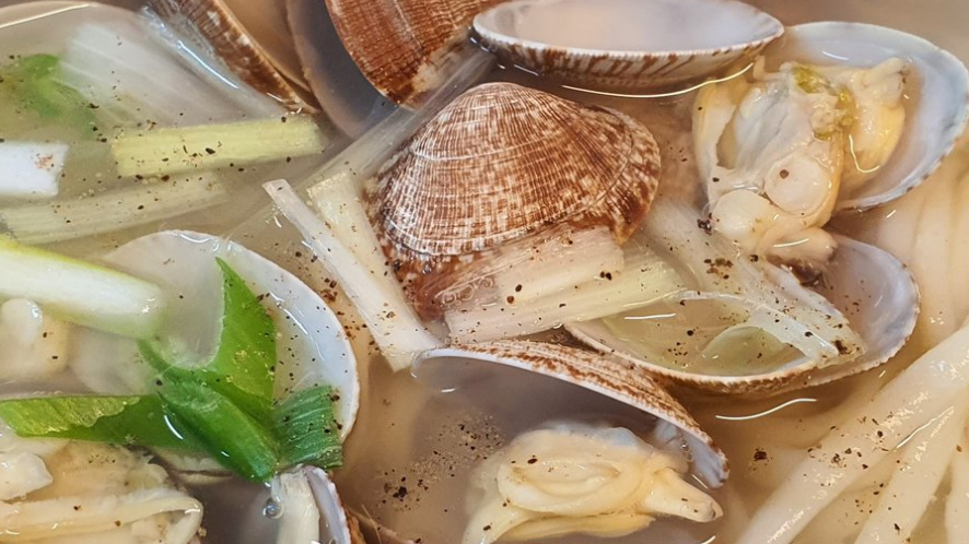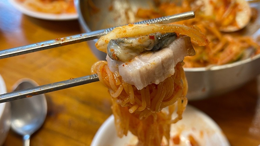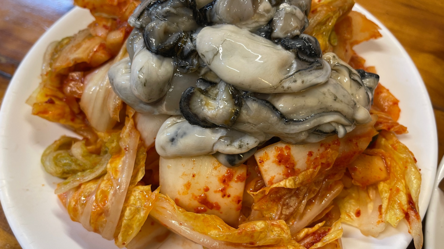 이곳에서는 굴보쌈을 포함한 보쌈 두 가지 메뉴를 즐길 수 있습니다. 우리 일행은 굴보쌈, 파전, 그리고 이곳의 시그니처인 바지락칼국수를 주문하여 맛있는 식사를 즐겼습니다. 특히 밑반찬으로 제공되는 새우젓은 이곳만의 비법 양념으로 맛있게 조리되어 돼지고기의 냄새도 없애고 풍미도 더해줍니다.