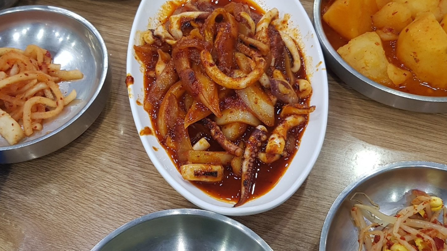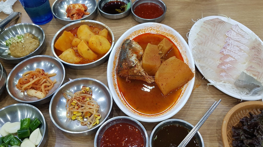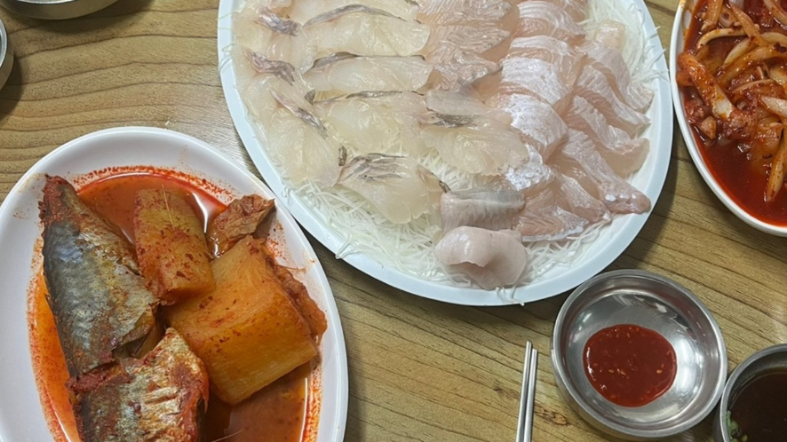 가게에 들어가자마자 시끄러움에 깜짝 놀랐는데요. 분위기는 조용한 곳이 아니라 생동감 넘치는 곳이라고 할 수 있겠습니다. 특히 어르신들이 많이 오시는데, 회정식과 함께 소주를 즐기는 모습이 인상적이었습니다. 그리고 회정식은 밥+회+감자조림+오징어볶음+고등어조림+매운탕+무생채+김치+콩나물무침+쌈채소 등이 한상 가득 나옵니다. 그리고 반찬은 좀 달지만, 그래도 나쁘지 않았습니다.