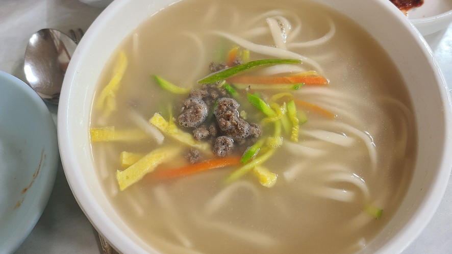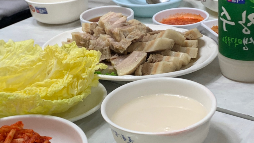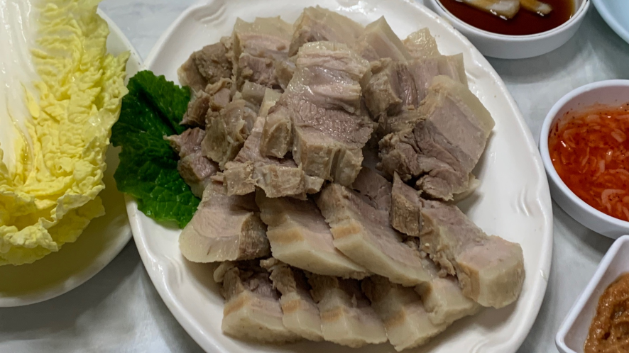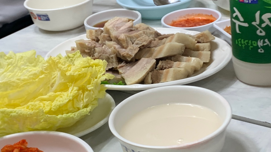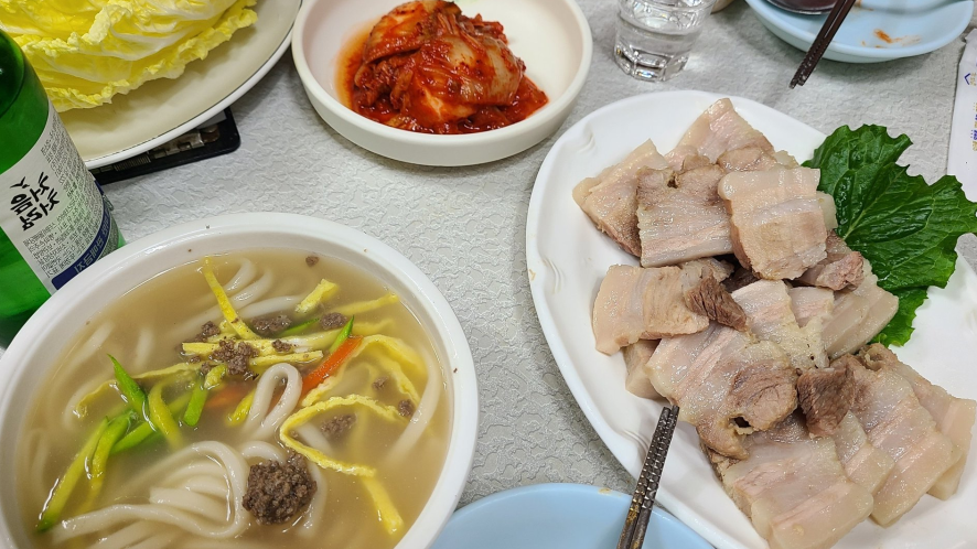 대련집의 메뉴는 보쌈과 칼국수 두 가지입니다. 저희는 보쌈과 칼국수 각각 한 그릇씩 주문했습니다. 보쌈은 야들야들하니 부드럽고 질기지도, 느끼하지도 않은 담백한 맛이었습니다. 쫄깃한 쌈과 함께 먹으면 입안 가득 퍼지는 고소함과 신선함을 느낄 수 있습니다. 칼국수는 깊게 우러진 사골 국물에 고소한 소고기랑 면이 들어가 있어요. 면은 쫄깃하고 국물은 진하고 풍부했습니다. 보쌈과 칼국수를 번갈아 먹으면서 쏘주를 한 잔씩 마시면 정말 극락 갈 조합입니다.