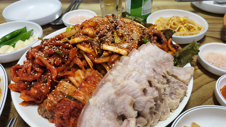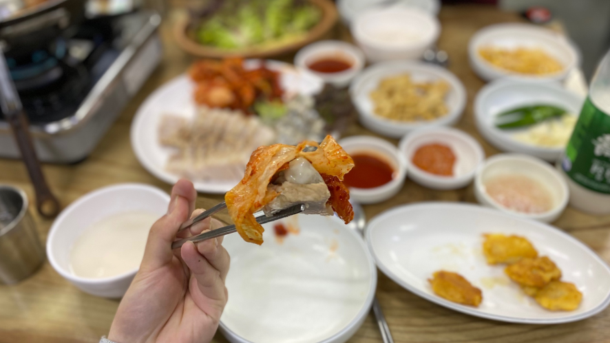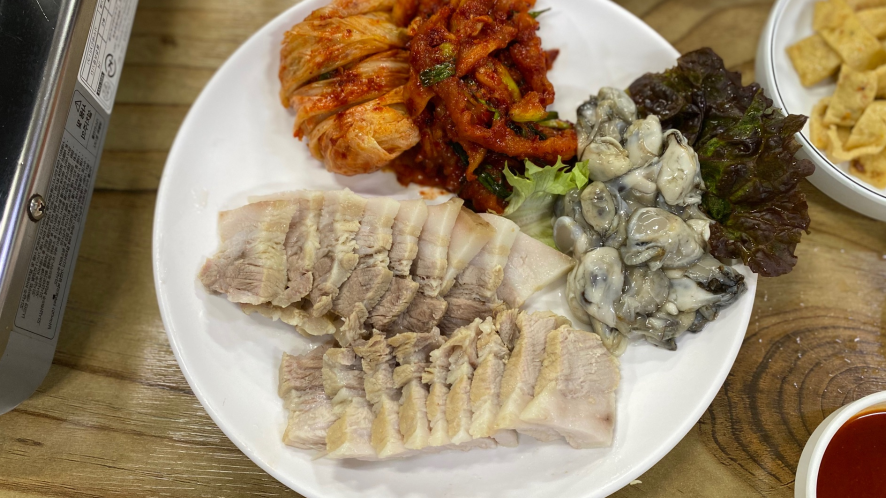 저희는 4명이서 굴보쌈 대(42,000원)를 주문했습니다. 보통 사이즈도 충분히 많은데 대 사이즈는 정말 푸짐해서 4명이 먹어도 남을 정도였어요. 보쌈은 삶아서 잘라놓은 고기와 삼겹살, 목살, 비계가 들어있습니다. 고기는 부드럽고 담백하고, 양념장과 겨자소스가 잘 어울려요. 굴은 뽀얗고 크고 싱싱해서 입안에서 바다향이 터지고, 속배추와 함께 싸서 먹으면 정말 맛있습니다.