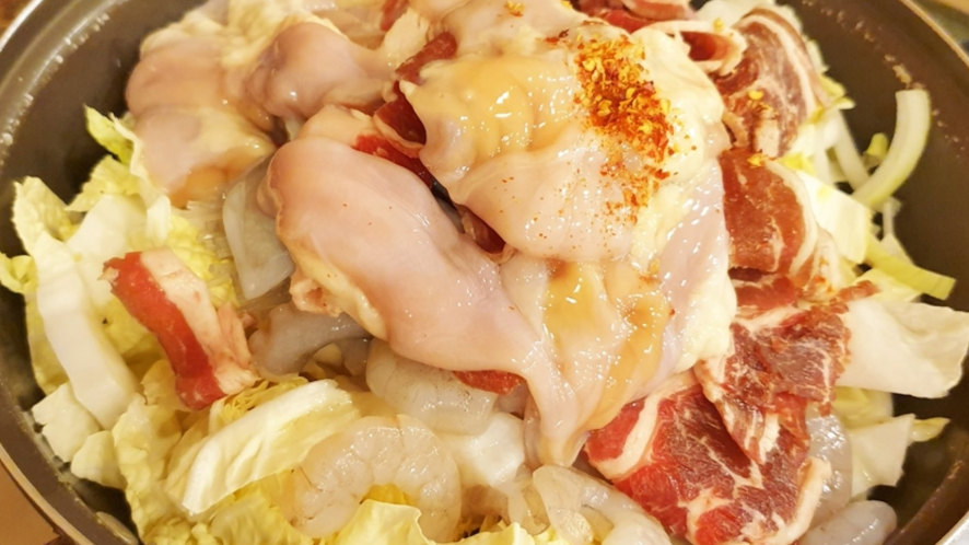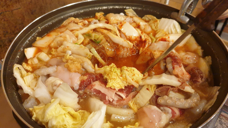 첫째, 대성식당의 낙곱새는 배추가 주재료입니다. 솥에 가득 채운 배추는 끓을수록 달콤하고 개운한 국물을 내주는데요, 이 국물이 술안주로 딱이라고 생각합니다. 배추와 함께 들어간 낙지, 곱창, 새우는 쫄깃하고 매콤한 양념과 잘 어울리는데요, 부산의 낙곱새보다는 덜 자극적이고 부드러운 맛입니다.
