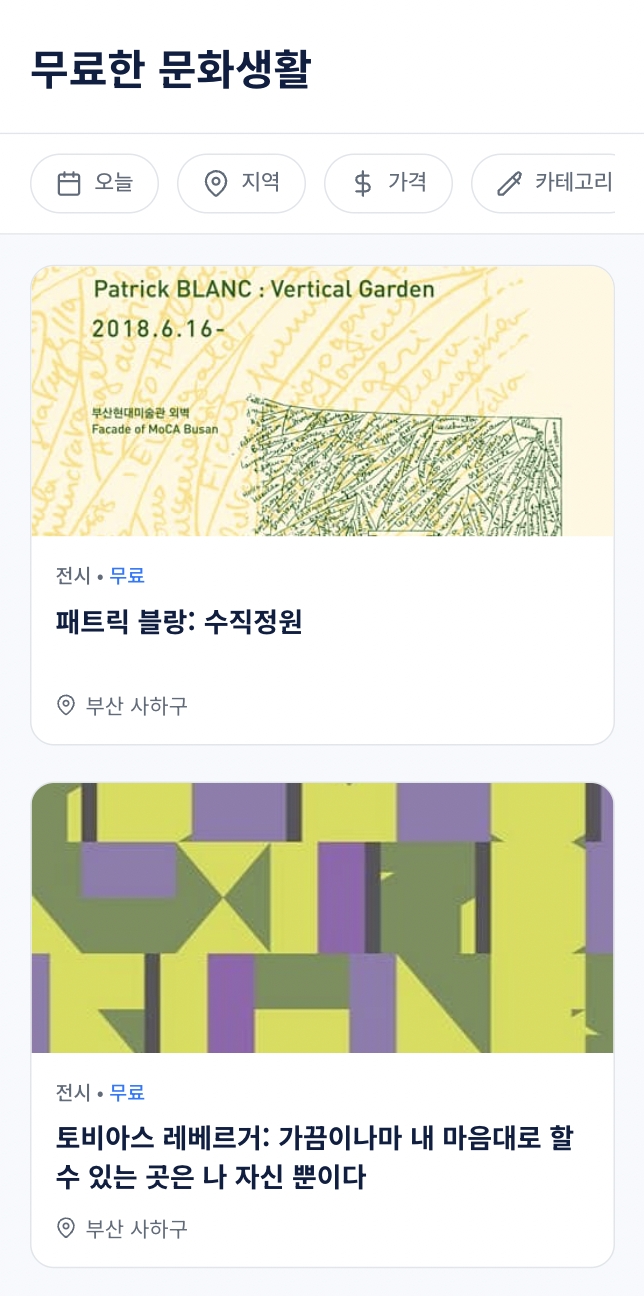 네이버나 구글에 '서울 무료 전시', '이번 주 부산 공연' 이렇게 일일이 검색해 보신 분들은 아실 거예요. 정보는 흩어져 있고, 클릭하면 유료거나, 광고뿐이라 답답했던 경험...🤦♀️