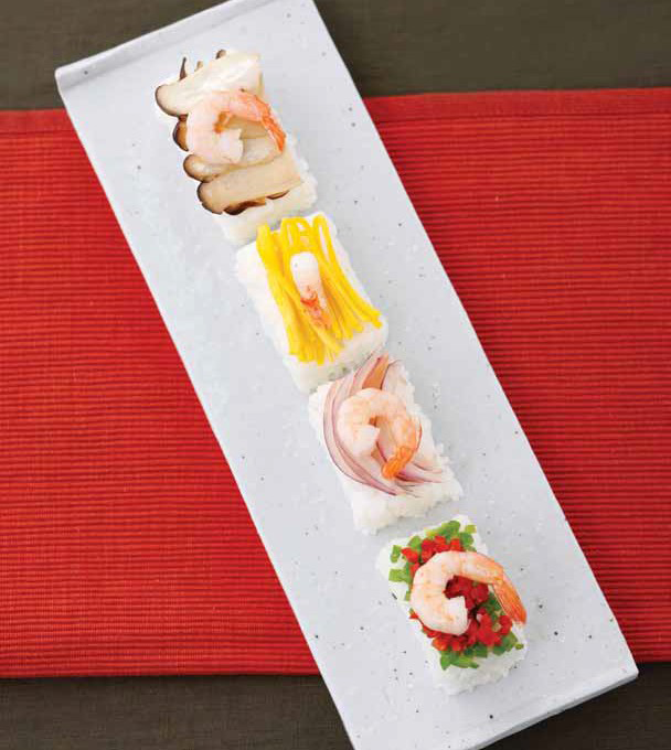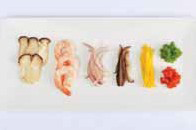 9. 초밥 위에 청피망, 홍피망, 양파, 달걀노른자, 새송이버섯, 표고버섯, 새우를 가지런히 놓는다.c