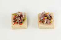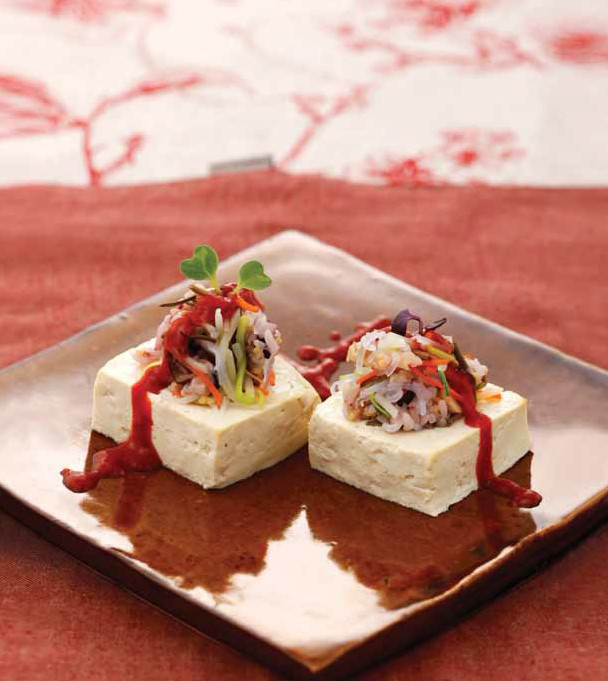7. 두부는 1.5×1.5×3cm로 자르고 잠길 만큼의 물을 붓고 3~4분정도 끓인 후 속을 파내어 그 속에 버무린 밥을 올린다.b