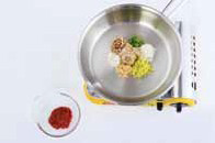 조갯살 10g, 새우살 10g, 오징어살 15g, 감자 18g(1/6개), 애호박 18g(1/9개), 양파 15g(1/8개), 청양고추 2g(1/5개), 표고버섯 5g(1/2장), 대파 2g(1cm), 마늘 3g(1/2쪽), 쌈장 10g(2작은술), 설탕 약간, 참기름 약간, 카놀라유 5g(1작은술), 고춧가루 약간