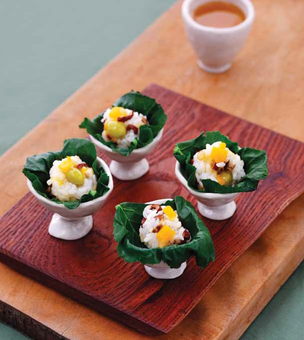 찹쌀 100g, 밤 30g(3개), 은행 20g(8알), 잣 10g(10알), 단호박 40g(4×8cm), 대추 5g(2개), 케일 3장(연잎도 가능)