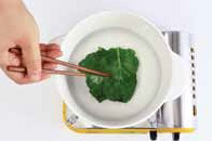 7. 케일을 깨끗이 씻어 끓는 물에 살짝 데친 뒤 찬물에 헹구어 물기를 뺀다.c