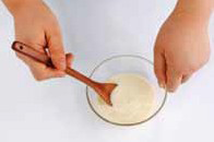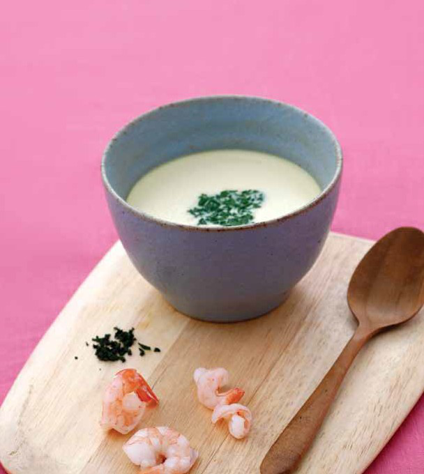 2. 연두부, 달걀, 생크림, 설탕에 녹인 무염버터를 믹서에 넣고 간 뒤 새우(1)를 함께 섞어 그릇에 담는다.b