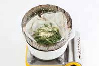 3. 찜기에 면보를 깔고 부추를 넣은 후 김이 오르게 쪄서 부추를 파랗게 익힌다.b