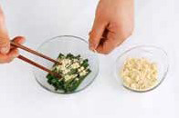 2. 부추에 날콩가루를 넣고 고루 섞이도록 버무린다.a