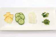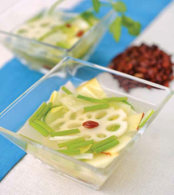 동치미국물 40g(2⅔큰술), 연근 30g(4cm), 무 20 g(3×3×1cm), 사과 30g(1/5개), 배추 10g(1장), 구기자 10g(5개), 오이 5g(2cm), 돌미나리 5g, 쪽파 5g