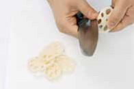 1. 연근은 껍질을 벗기고 얇게 썰어 식초물에 10분 정도 담구어 녹말을 빼내고, 갈변을 방지한다.a