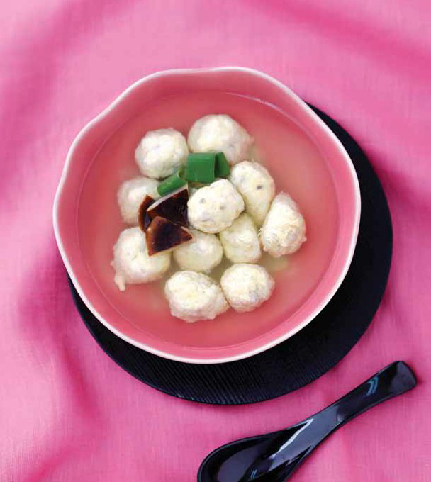 6. 끓는 육수에 달걀물을 입힌 완자 를 넣고, 완자가 익어 동동 떠오르 면 고명으로 준비한 표고버섯, 파, 남은 달걀물을 넣고 끓인다.
