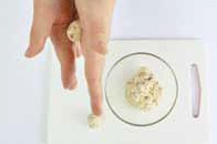 5. 두부와 표고버섯을 고루 섞어 둥 글려 완자 모양으로 빚어 밀가루 를 입힌 후 달걀물을 입힌다.c