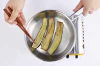 2. 가지는 길게 길이를 살려 얇게 저민 후 달궈진 프라이팬에 올리브유를 두르고 센불에서 물기가 생기지 않게 굽는다.b