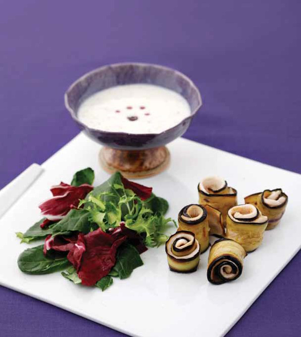6. 접시에 구운 가지와 닭가슴살 말이를 올리고 잎채소와 들깨 드레싱을 곁들인다.