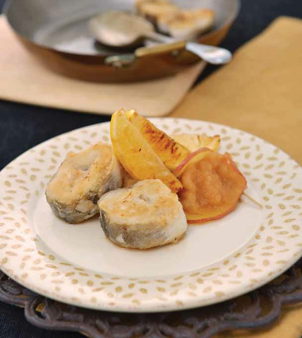 6. 접시에 구운 대구(4), 사과, 레몬(5) 을 접시에 담고 남은 사과레몬 소 스를 곁들인다.c