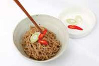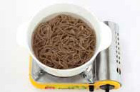 6. 끓는 물에 메밀국수를 넣은 뒤 뚜 껑을 닫고 끓어오르면 1/2∼1컵 정 도의 찬물을 부어 거품을 가라앉 히는 과정을 한 번 더 되풀이한 다 음 찬물로 맑게 헹군 후 체에 건져 서 물기를 제거한다.b