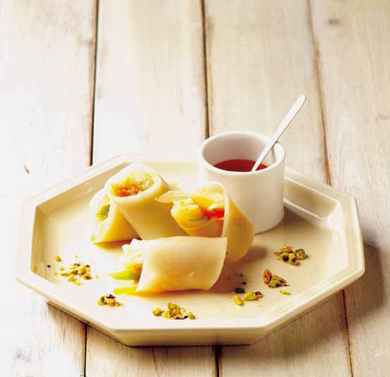 7. 밀전병 위에 5를 넣고 말아 준 후 3cm로 썬다.