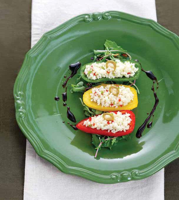 8. 반으로 자른 파프리카에 쿠스쿠스 를 소복하게 담고, 썰어놓은 올리 브를 올리고 발사믹 비네그레트 소스를 뿌린다.