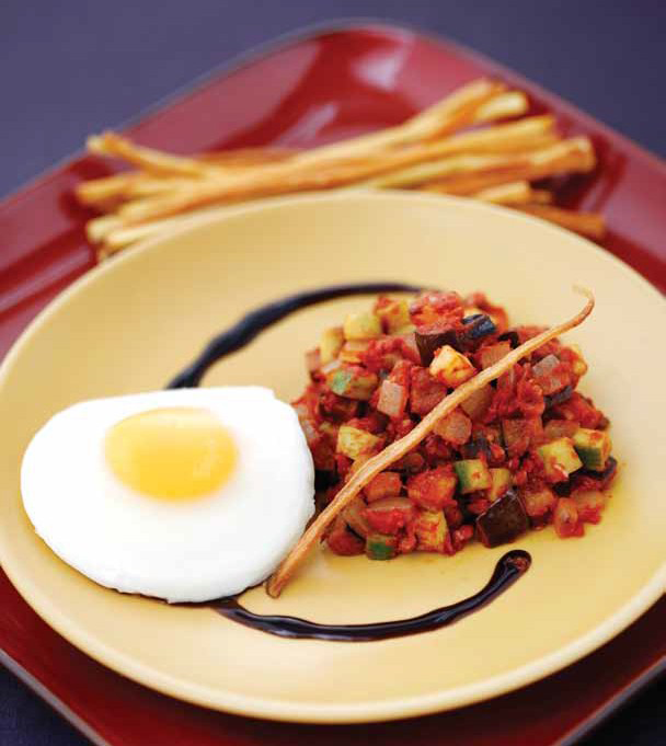 9. 접시에 고구마스틱, 라따뚜이, 수 란을 담고 발사믹 식초를 곁들인 다.