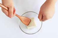 2. 누룽지(1)를 정사각형 모양으로 잘 라 180도의 기름에 넣고 3~5초 정도 튀기면 밥풀이 부풀어 오르 는데 이때 꺼내어 기름을 뺀다.