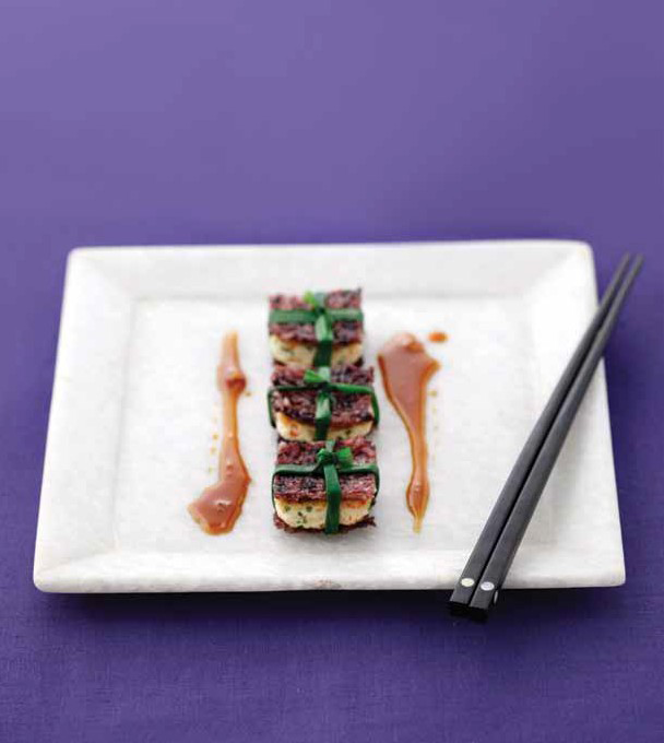 9. 준비한 재료들(8)을 누룽지 위에 올리고 누룽지로 덮어 부추로 묶 는다.