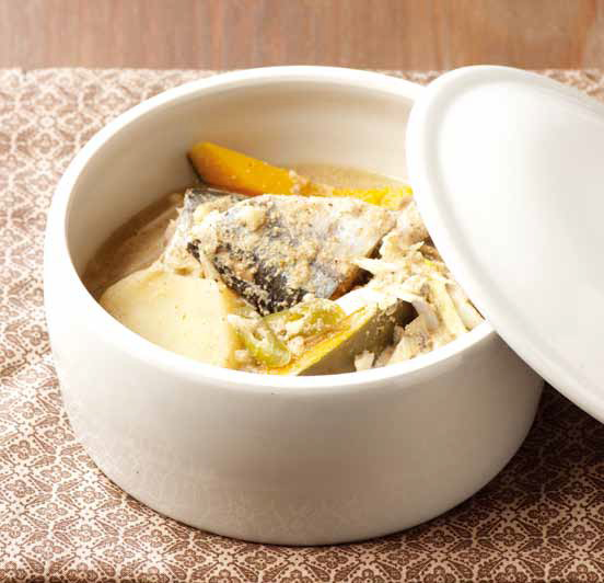 7. 뚝배기에 감자를 깔고 꽁치, 느타리버섯, 단호박을 올린 뒤 조림양념을 얹 어 조린다.