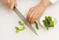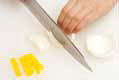 3. 무, 양파, 홍 피망, 황파프리카는 1×1×4cm 크기로 썬다.b