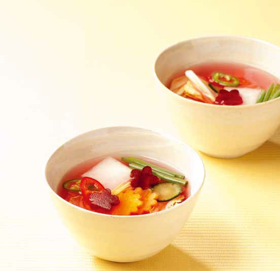배추 15g(1장), 무 5g(2cm), 비트 10g(2cm), 오이 10g(3cm), 생강 2g(1cm), 마늘 2g(1개), 쪽파 5g(12cm), 청양고추 2g(1/5개), 홍고추 2g(1/5개), 당근 5g(1cm), 저염소금 1.5g, 양파15g(1/20) 육수