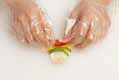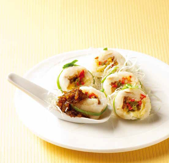 4. 대구포에 밀가루를 묻혀 청파프리카, 홍파프리카, 황파프리카, 황금팽이버섯을 넣고 말아 미나리로 묶어 찐다.c