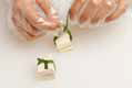 10. 김치를 넣은 두부를 부추로 묶는다.c