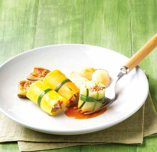 10. 밀전병에 고기, 관자, 홍파프리카, 팽이버섯, 호박 넣어 동그랗게 말아 데친 부추로 묶는다.